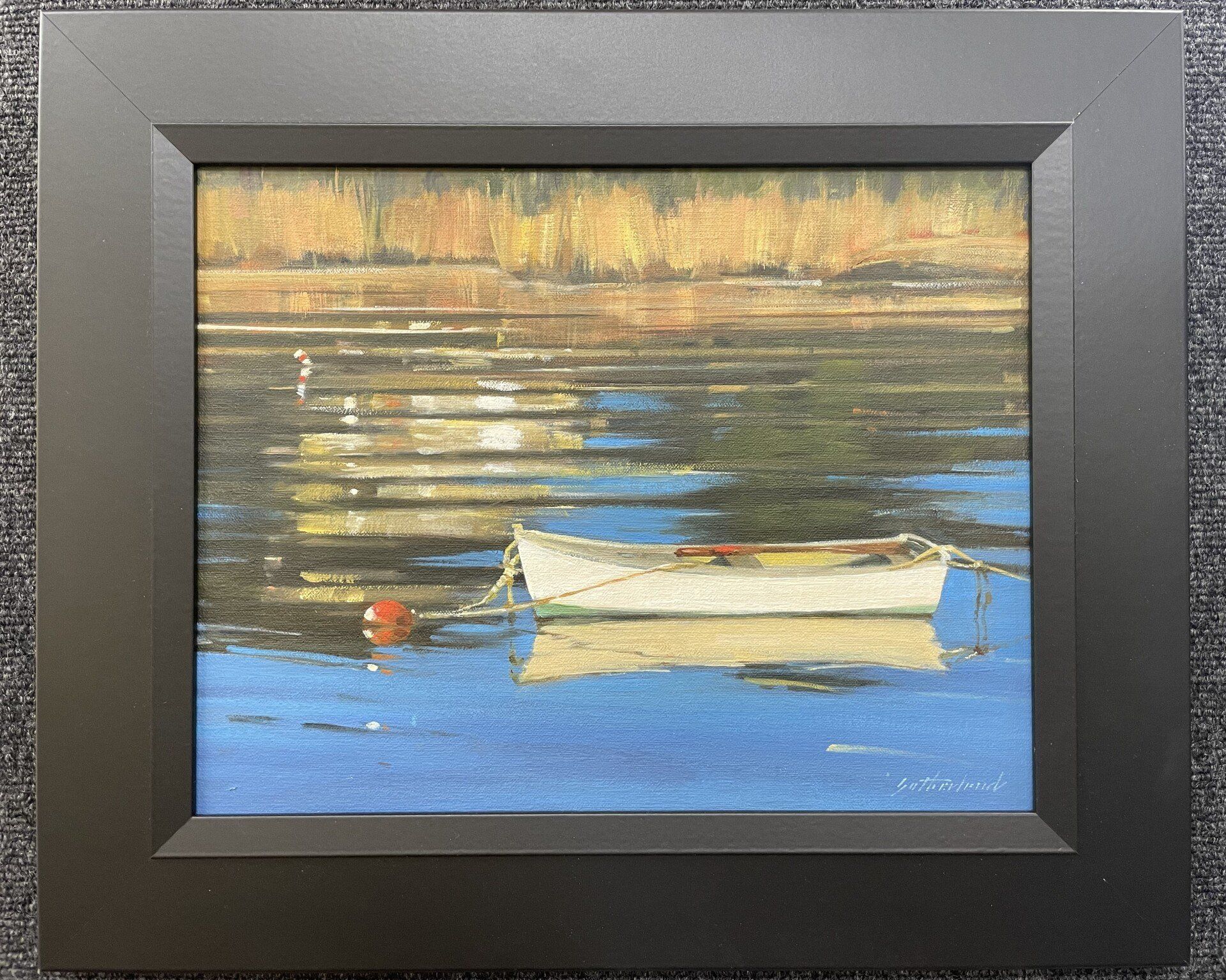 Janet Sutherland is a graduate of the Cooper Union School of Art, NYC she began her career illustrating books. A member of the North Shore Arts Association, the Rockport Art Association & Museum and the Oil Painters of America, she has painted for 2 decades and been the recipient of numerous awards. "End of Day" depicts a small boat in the warmth of the setting sun at Lanes Cove, Gloucester.