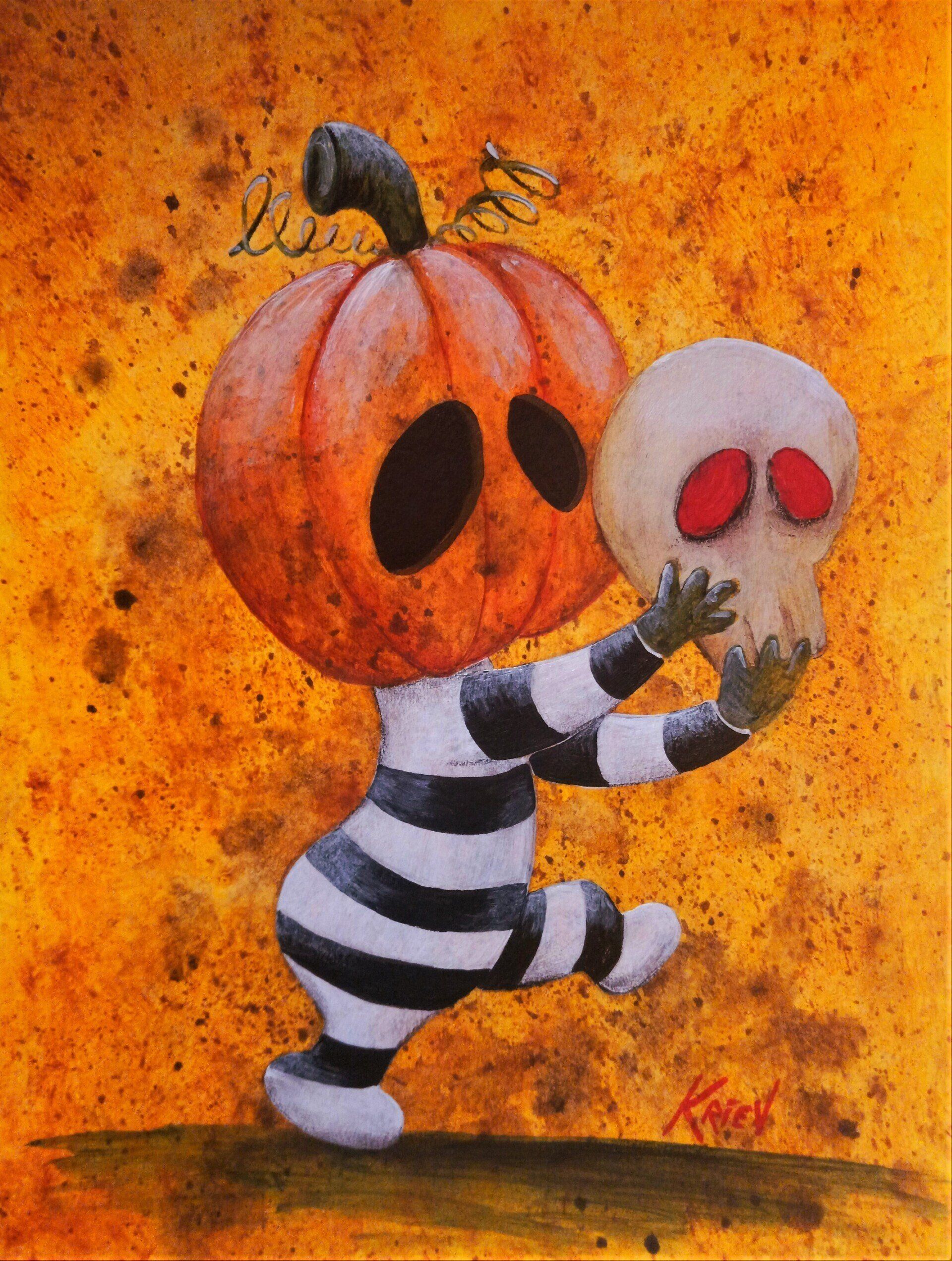 KRIEV is a Boston-based artist. Creepy-cute is a term that best describes Kriev’s work. Inspired by pop culture as well as mythology, Kriev’s paintings are infused with gothic imagination and humor. Robots, zombies, button-eyed children and pumpkin people evolve in a whimsical colorful world where every child, or inner child, is welcome.